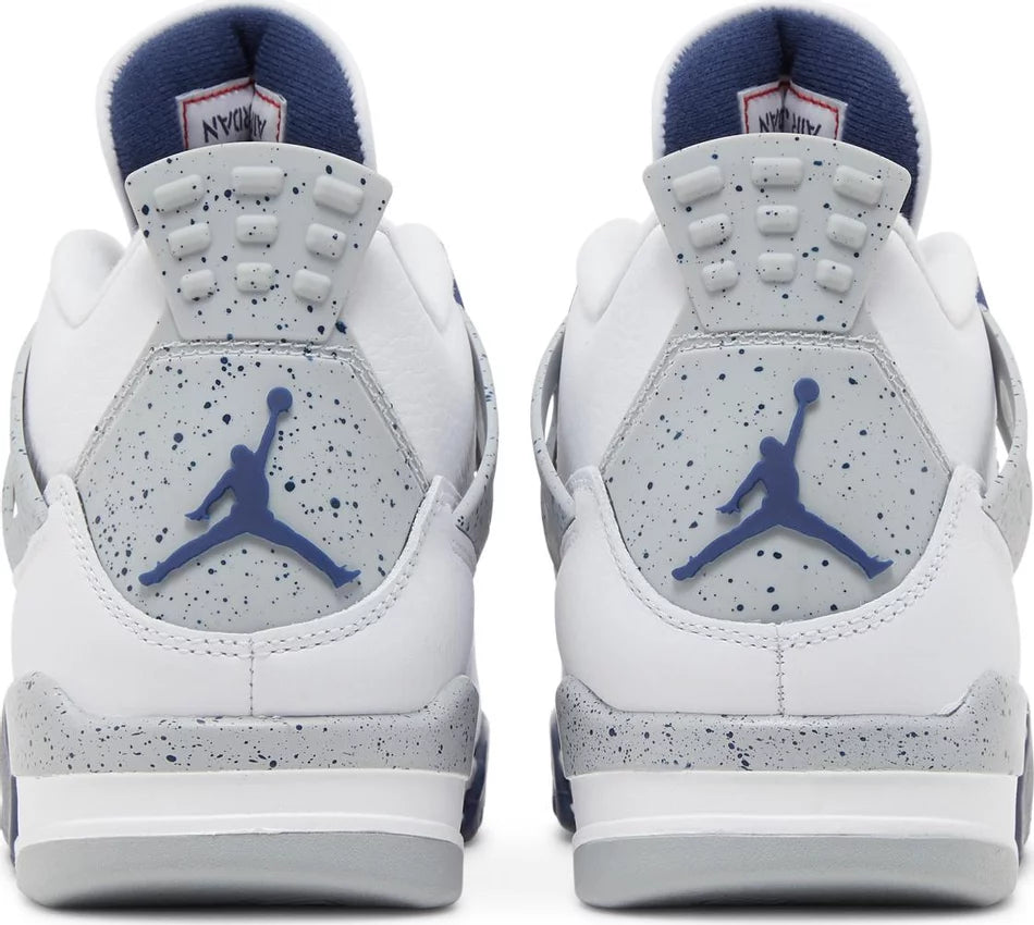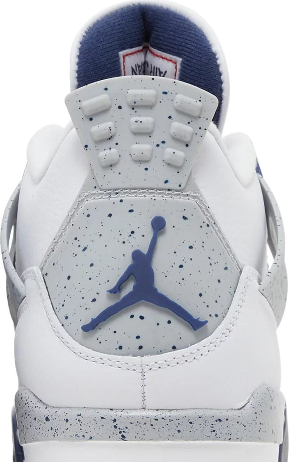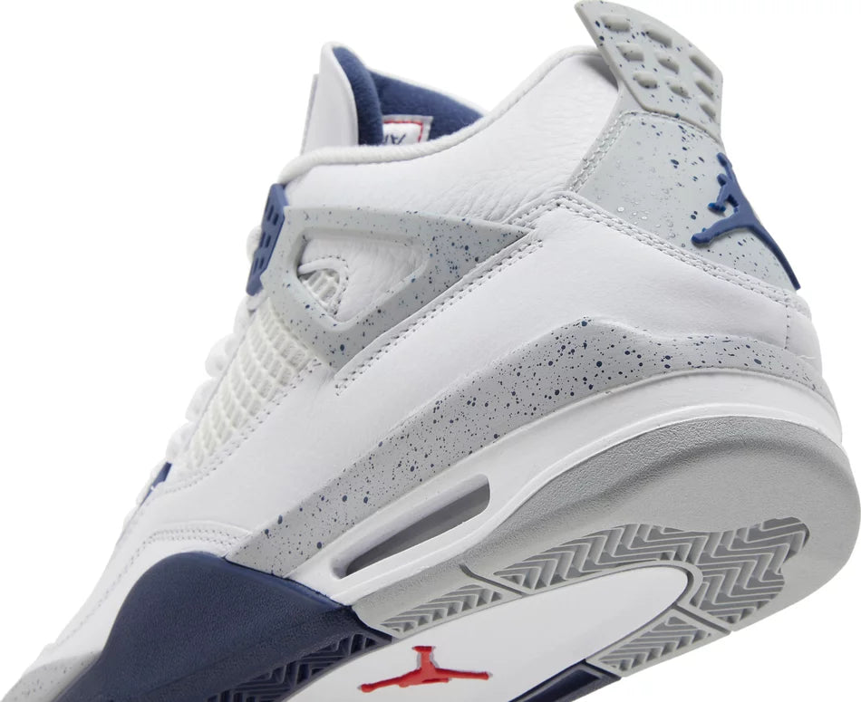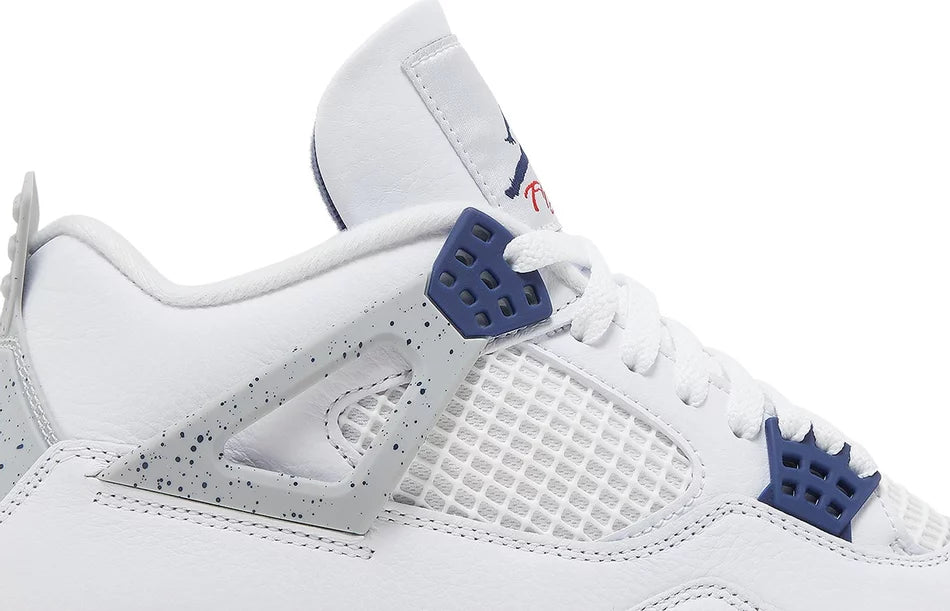 The Air Jordan 4 Retro ‘Midnight Navy’ dresses the legacy silhouette in the same color blocking used on the OG ‘Fire Red’ colorway. The upper is constructed from white leather with black support wings, a matching black heel tab with embossed Jumpman branding, and navy molded eyelets. A second Jumpman icon adorns the woven tongue tag in crimson. The sneaker rides on a two-tone polyurethane midsole, featuring encapsulated Air in the forefoot and a visible unit in the heel.